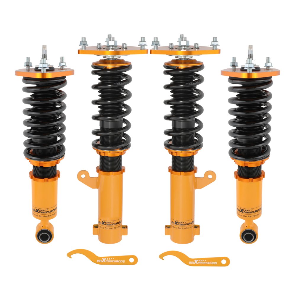 El amortiguador y el resorte se ensamblan como un todo antes de la instalación y se reemplazan como un todo cuando falla alguno de los dos subconjuntos. Los 24 kits de Coilovers ajustables de Maxpeedingrods pueden ajustar la altura del vehículo y la fuerza del amortiguador. Esto le permite marcar perfectamente en el sistema de bobinas. Puede disfrutar de una experiencia de conducción cómoda en todas las condiciones de la carretera.